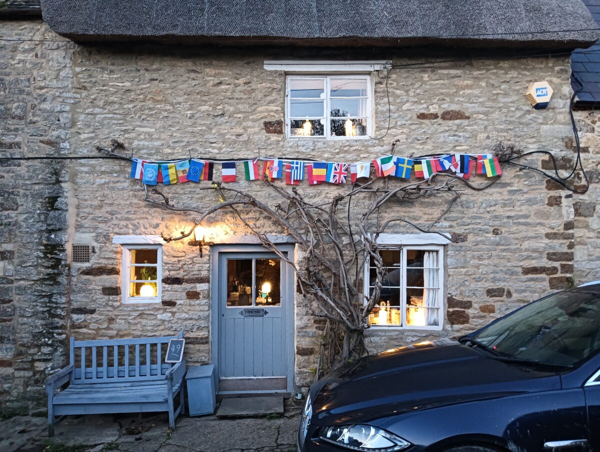 Yesterday, I cleared the wisteria from the front of the cottage. I’d already set up the ‘lanterns’ in the windows a few days before. With the leafage out of the way, I was able to put up some bunting. Not just any bunting but an array of international flags – intended as a counter to the two or three Union Jacks and St George’s Crosses that I am fairly sure are intended as misguided signs of nationalism disguised as ‘patriotism’.
