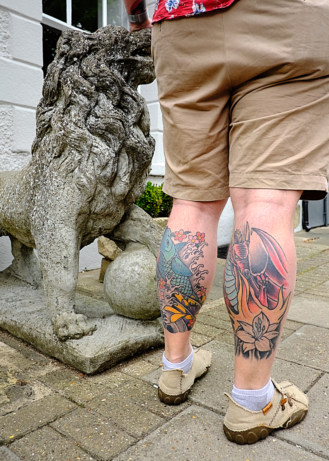 This street photograph shows the back of a figure standing: shorts, trainers, the calves fully visible. Across those calves, vivid tattoos – one a koi fish, the other a lotus flower and possible dragon form – announce themselves in colour and detail. The photographer and subject are strangers; the image is candid. Yet this moment brings into focus a complex web of meaning that stretches beyond the skin. From psychological, sociological, anthropological, and spiritual perspectives, the tattoos form a lifelong narrative. The photograph adds another layer, transforming private expression into public representation.